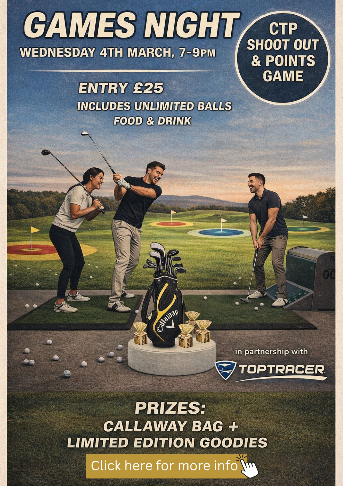 Practice like a pro all year round. Our floodlit, undercover driving range features the latest Toptracer technology on touch screen monitors to take the guesswork out of your session. Club hire available at reception