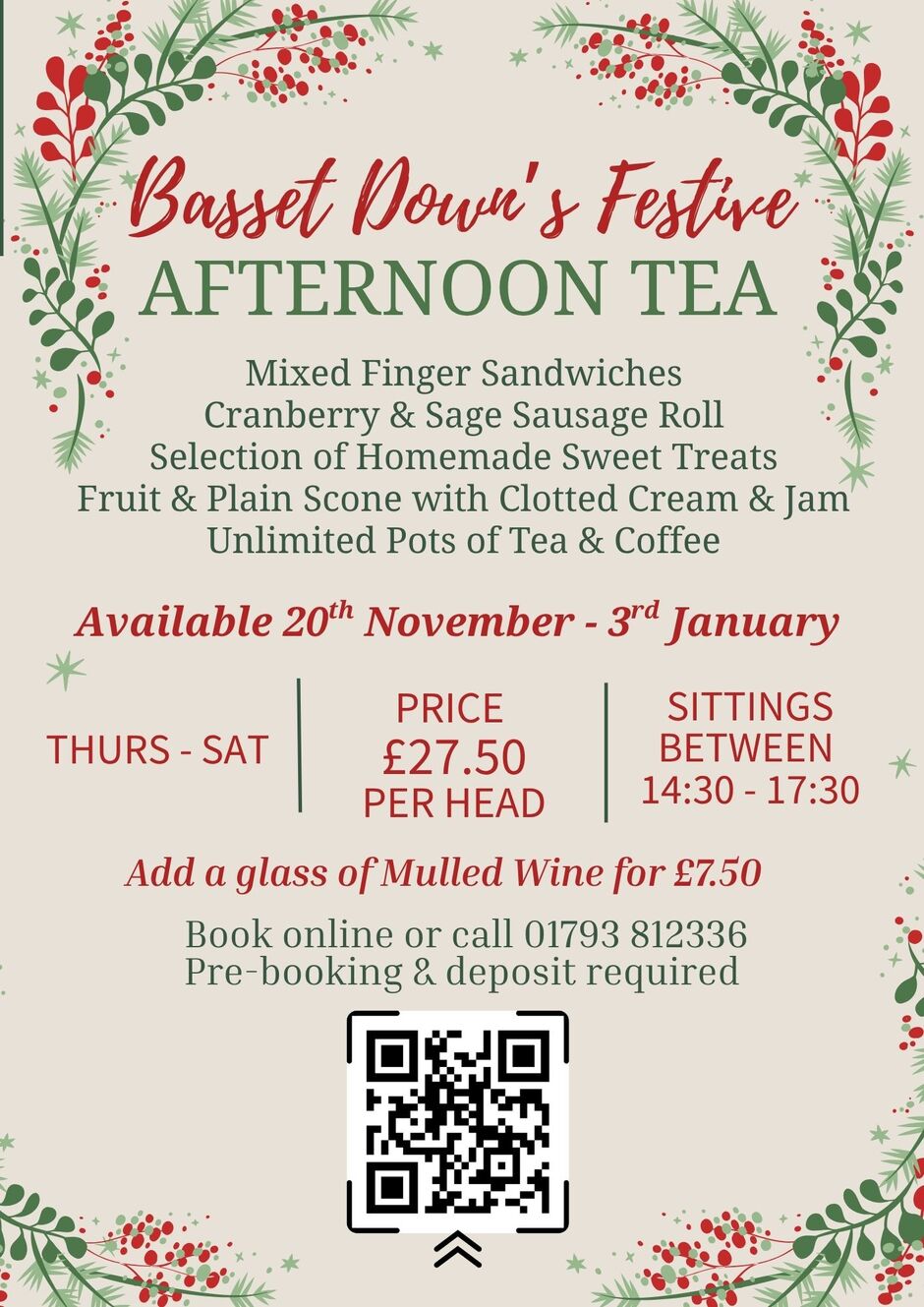 All Afternoon Teas must be pre-booked and a £15/head deposit is required to secure your reservation. If you need to cancel or amend your booking, we kindly ask for at least 24 hours’ notice for a full refund or transfer of your deposit. Cancellations made after this time will unfortunately result in loss of deposit. To book, please select a time below, email restaurant@basset-down.com or call our team on 01793 812336 (option 2).