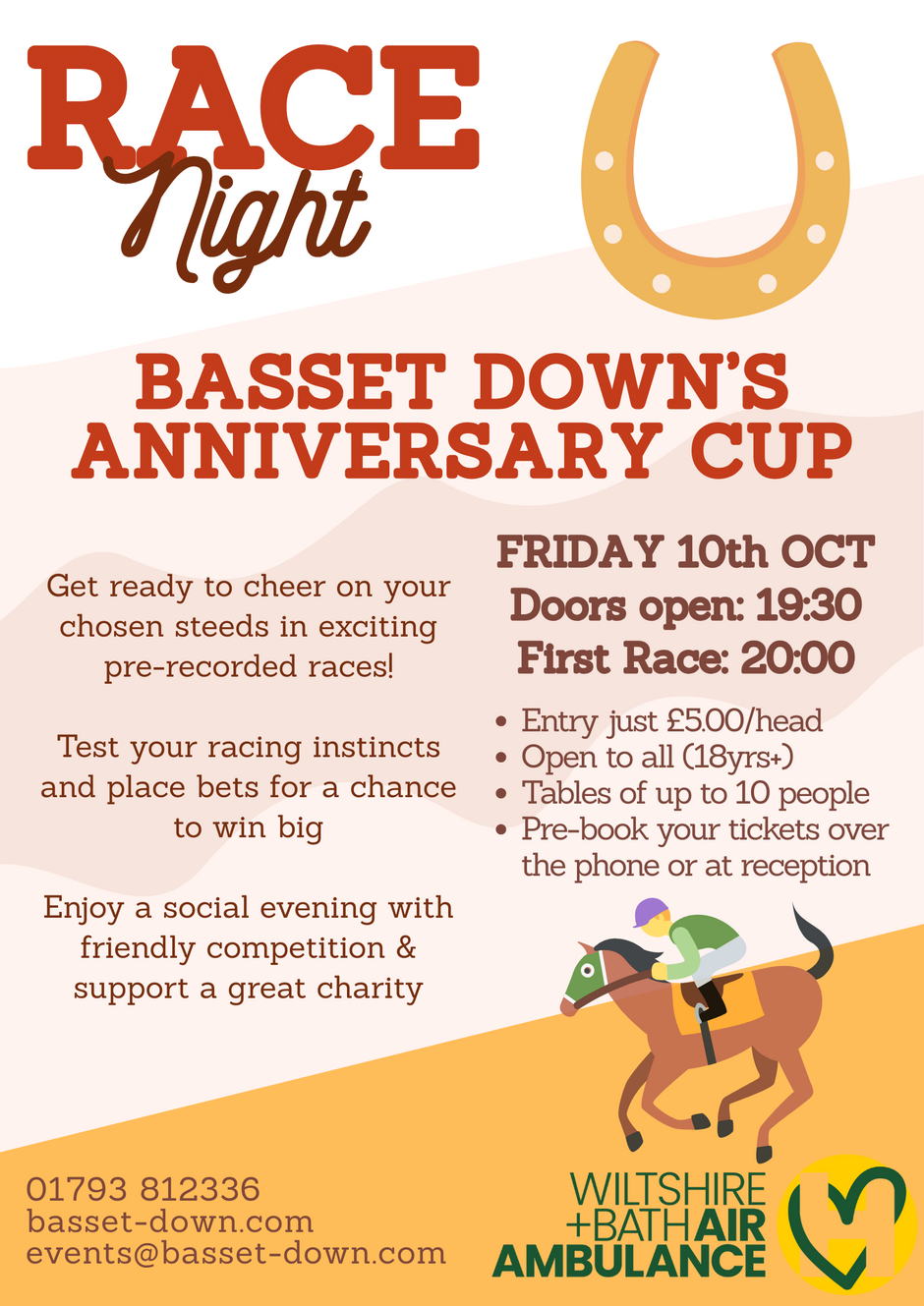 Join us for a night at the races! We’re excited to invite you to our first ever Race Night, The Anniversary Cup, on Friday 10th October - a social evening packed with fun, friendly competition and the chance to win big, all in support of Wiltshire Air Ambulance.